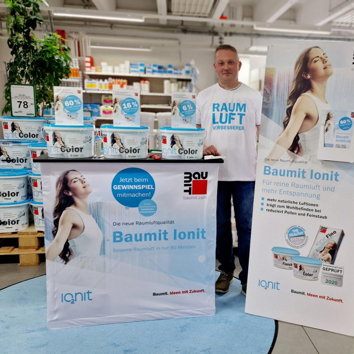 Bei ausgewählten Baumärkten und Baustoffhändler:innen sind Merchandising Verkaufsprofis im Einsatz, um die Kund:innen vor Ort zum Thema Ionit Wandfarbe von Baumit zu beraten.